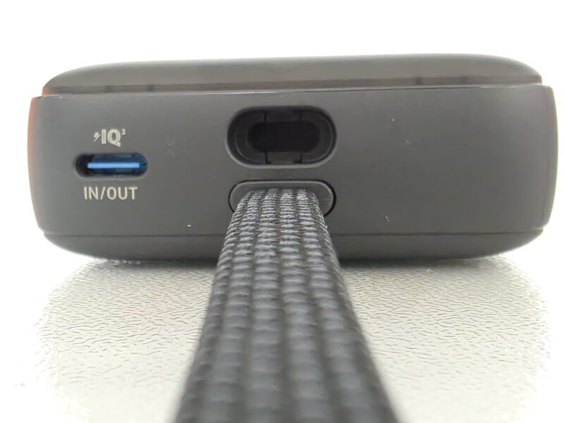 本体上部には一番の特徴である内蔵Type-CケーブルとIN/OUT対応のType-Cポートがあります。