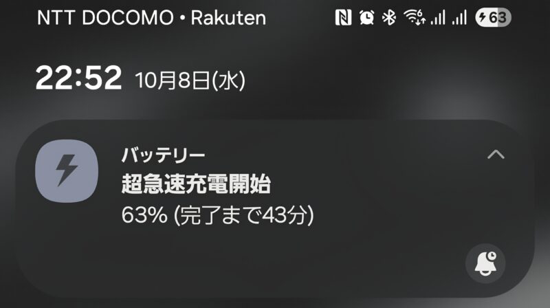 現在、利用しているスマートフォン(Galaxy S25 Ultra)を内蔵Type-Cケーブルで充電してみると・・・