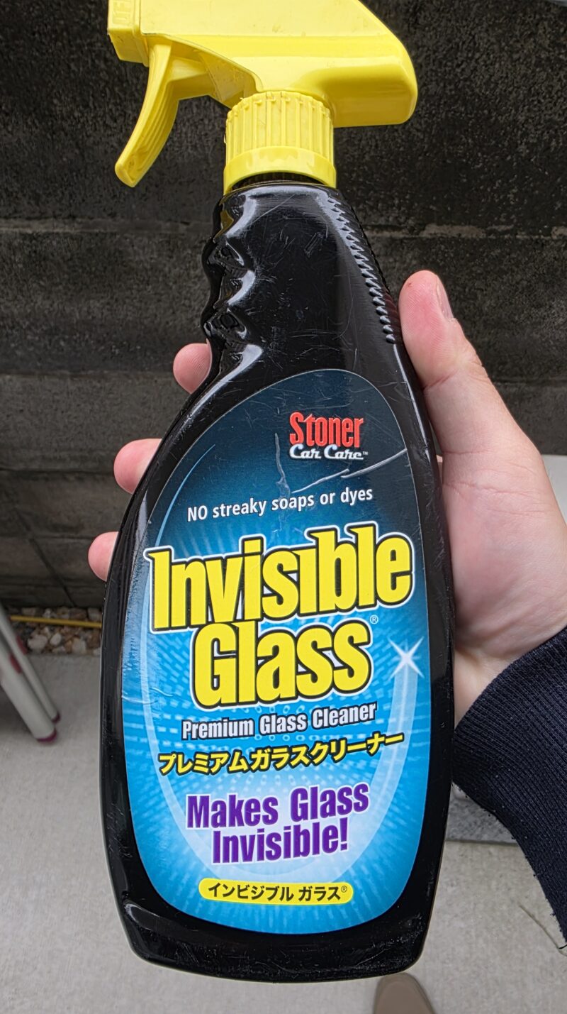 ガラスクリーナーには、拭きスジが残らず透明感の高い仕上がりになる インビジブルガラス(呉工業・ストーナー) がおすすめです。ミラー面だけでなく、周辺のゴム枠も拭いておくと液だれ跡が残りにくくなります。