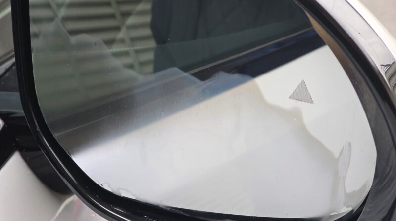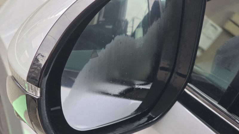 施工前のサイドミラーはほぼ親水状態で、雨が強い日には水滴が張り付いて視界が悪化する状態です。まずミラー面の油脂・ホコリ・水アカをしっかり除去してから施工します。
