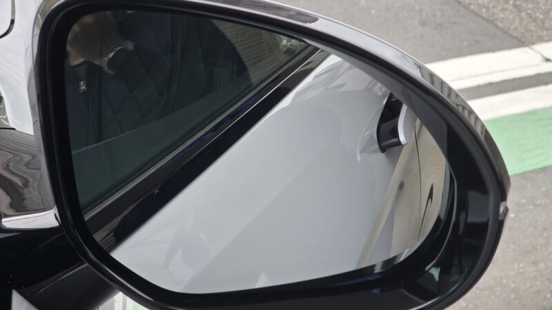 施工完了後に水をかけると、水滴が全くミラー面に留まらず、すぐに滑り落ちる様子が確認できます。通常の撥水コートとは明らかに違う、「水を弾く」というより「水が寄り付かない」感覚です。