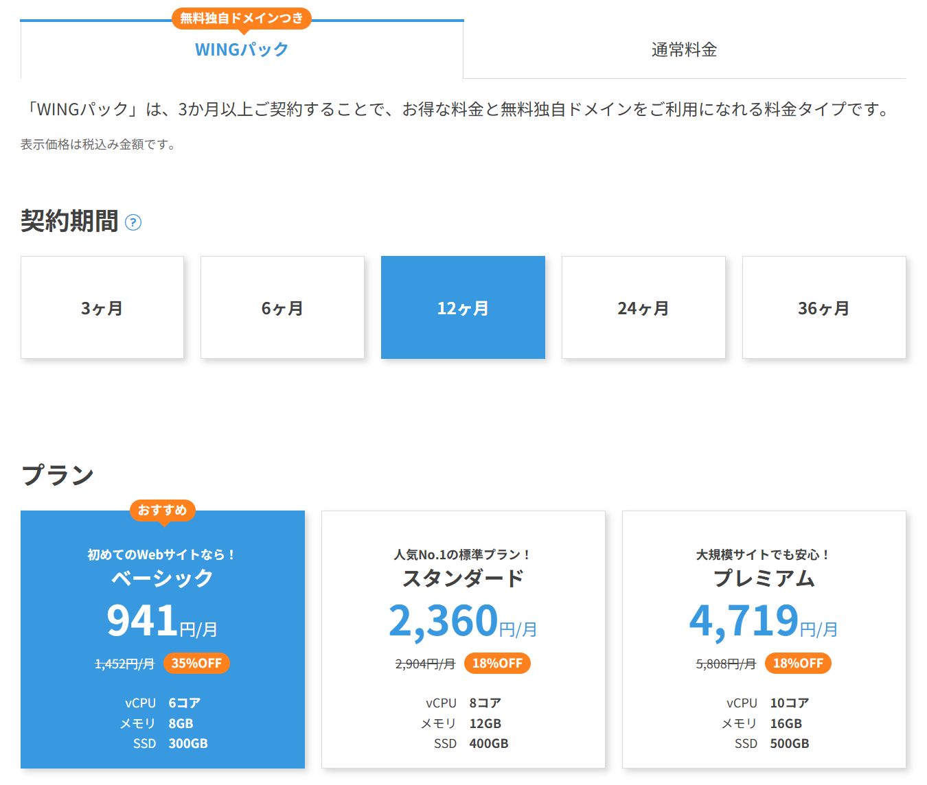 最初は「ベーシックプラン(WINGパック)」で十分です。必要な機能はすべて揃っています。契約期間は12ヶ月がコスパと継続しやすさのバランスが取れておすすめです。筆者も5年間ずっと12ヶ月更新で使い続けています。