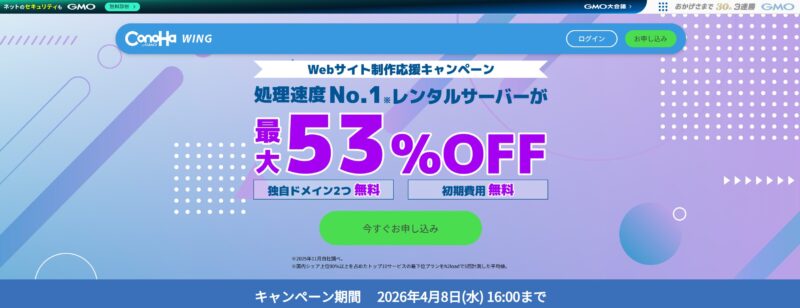 特に2026年4月現在は「Webサイト制作応援キャンペーン」が実施されており、収益化ブログを始めるには絶好のタイミングとなっています!
