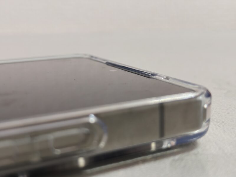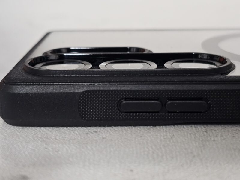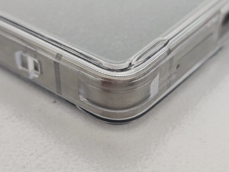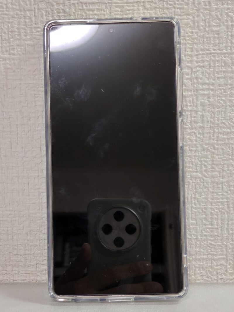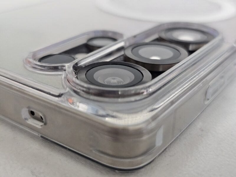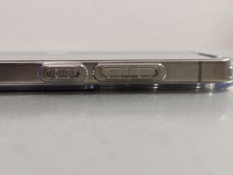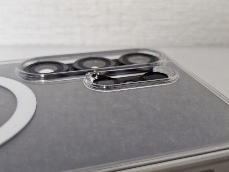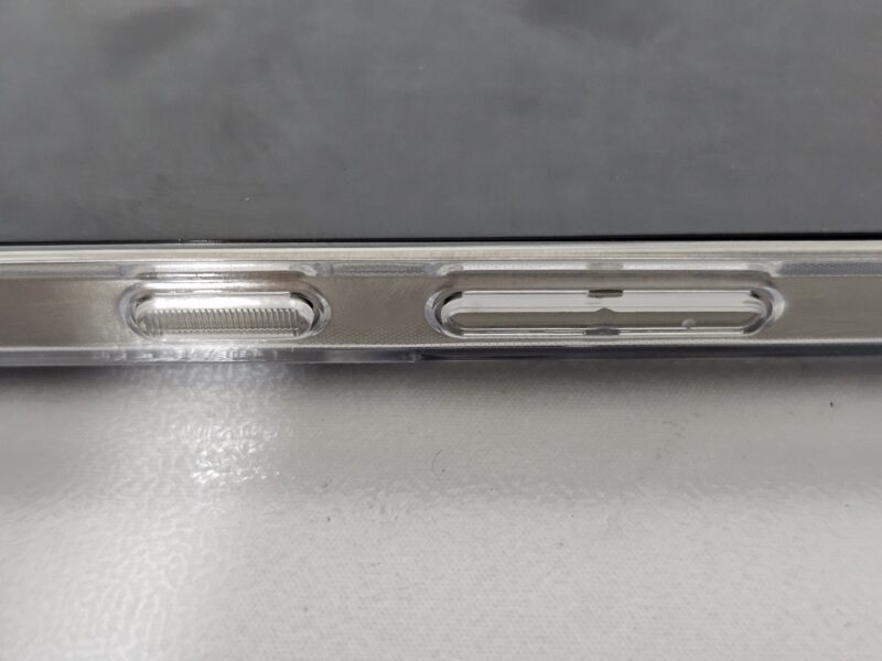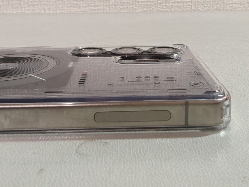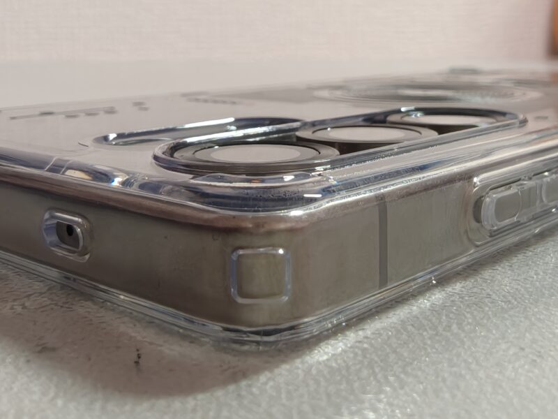 装着してみると、ボタンの押し心地やカメラ周りのカットアウトの精度が高く、フィット感は良好です。背面の透明度も高く、端末本体の質感をしっかり活かしてくれます。