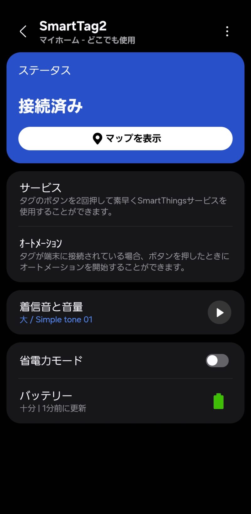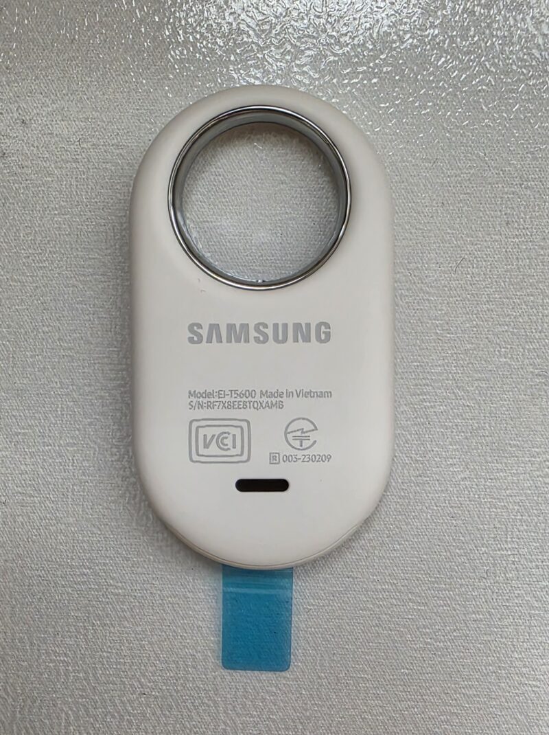 SmartThingsアプリとの連携がスムーズで、位置履歴の確認・音鳴らし・AR検索(カメラを使って方向を視覚的に案内)など機能が充実しています。バッテリーはボタン電池(CR2032)で、公称で最大約6ヶ月持つとされています。