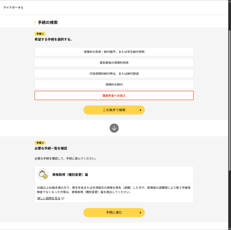 手続きの検索画面に移るので「国民年金への加入」を選択して、資格取得(種別変更)届の手続きに進みます。
