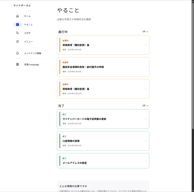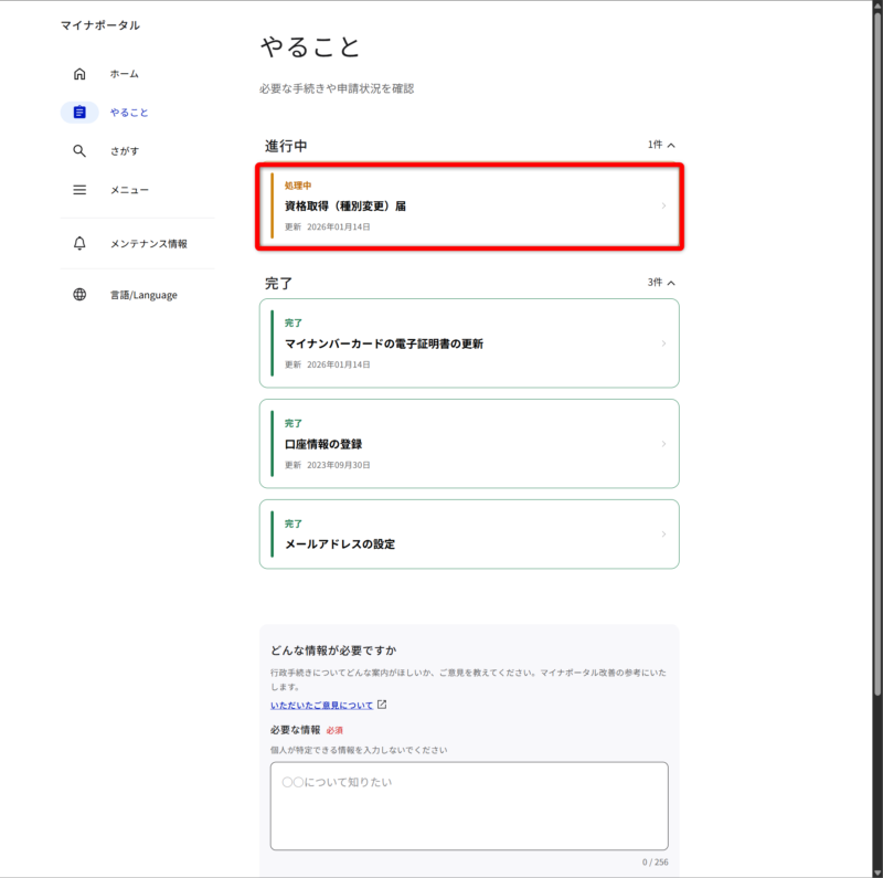 ホーム画面左の、「やること」を選ぶと先ほど申請した内容の進行状況を確認することができます。