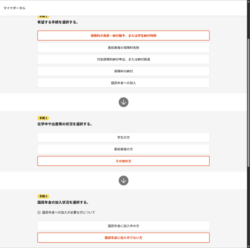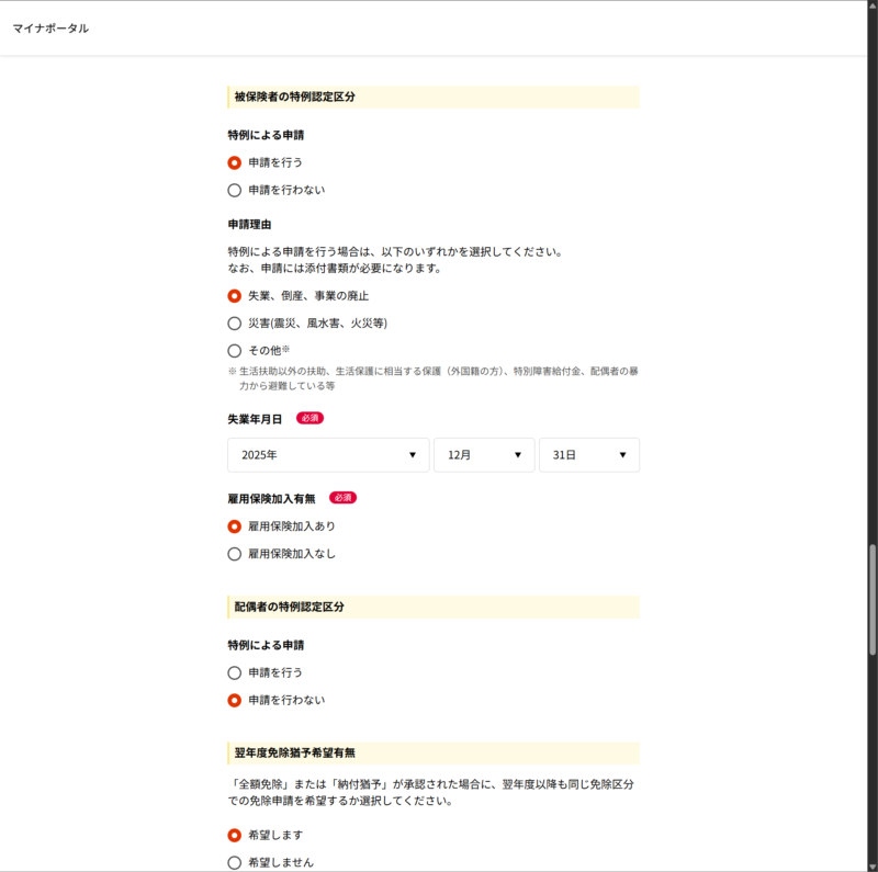 ということは、国民年金への切り替えと同時に、国民年金保険料免除・納付猶予の申請も行いたい場合は、ここからの手順が正しそうです…。